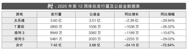 3月16日至22日,体彩全国联销游戏(大乐透、7星彩、排列3、排列5)通过7.42亿元的发行量,筹集了2.66亿元公益金。当周发行量比去年同期减少16.62亿元,同比降低69.13%。当周体彩发行量同比下降较多的主要原因是湖北、北京等地的体彩实体店尚未恢复销售以及竞猜型游戏销售场次大幅减少所致。当周共开出17注500万元及以上大奖,其中体彩大乐透16注,7星彩1注。