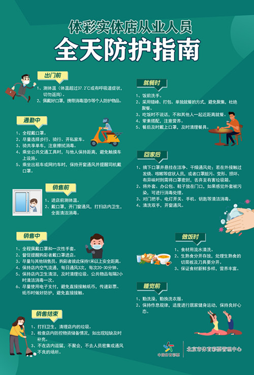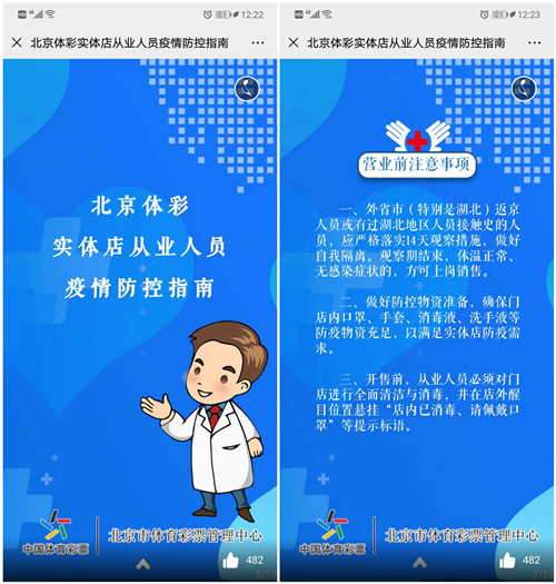 在发放防疫物资的基础上,北京体彩中心还制作了《北京体彩实体店新冠肺炎防控指南H5》、《体彩实体店从业人员全天防护指南》电子海报、《科学防疫从我做起》宣传视频,详细介绍了实体店日常防护和清洁消毒要点,无死角的科学宣传防疫知识,确保防疫工作做实做细。