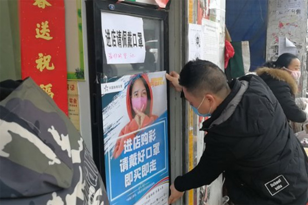 工作人员协助代销者张贴防疫海报