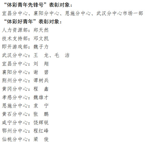 经过民主推荐和自发报名,省体彩中心党委组织专班对参评对象进行综合评审后,决定授予宜昌分中心等4个单位或团体“体彩青年先锋号”荣誉称号、郑天然等15位同志“体彩好青年”荣誉称号。同时,希望受表彰单位和个人珍惜荣誉、再接再厉,弘扬“爱国、进步、民主、科学”的“五四”精神,充分发挥模范带头作用,在推进责任彩票建设和湖北体彩健康发展中建功立业。