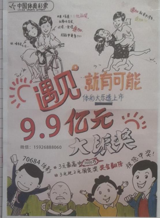 这些振奋人心的宣传语,也同样出现在了体彩代销者们的手绘海报中。为了更加生动形象地普及活动内容,湖北体彩襄阳分中心鼓励实体店自制手绘海报,进行才艺大比拼。实体店代销者和销售员们积极响应,短短两天时间,分中心就收到了50多份手绘海报。透过一幅幅精心绘制的海报,大家复工复市的热情、激情以及对大乐透的喜爱之情跃然纸上。