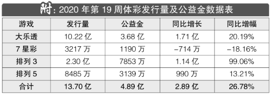 5月4日至10日,体彩全国联销游戏(大乐透、7星彩、排列3、排列5)通过13.70亿元的发行量,筹集了4.89亿元公益金。当周发行量比去年同期同类游戏的发行量增加2.89亿元,同比增长26.78%。当周共开出33注500万元以上大奖,全部出自体彩大乐透。当周,北京体彩时隔105天后复市,全国联网单场竞猜游戏时隔46天后开售。
