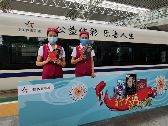 5月12日下午,由四川省体育彩票管理中心举办的“行大运送锦鲤”体彩即开型彩票展示活动在成都东客站举行。活动现场,工作人员登上由中国体育彩票冠名的成绵乐客运专线,为旅客们送上四川省体彩中心提供的“炫青春行大运”成都大运会主题即开票。赠票活动受到热烈欢迎,60张大运票很快就全部送出。体彩专列上的旅客们津津有味地刮奖,感受体彩送出的“大运”,更有机会获得“锦鲤”购彩金。