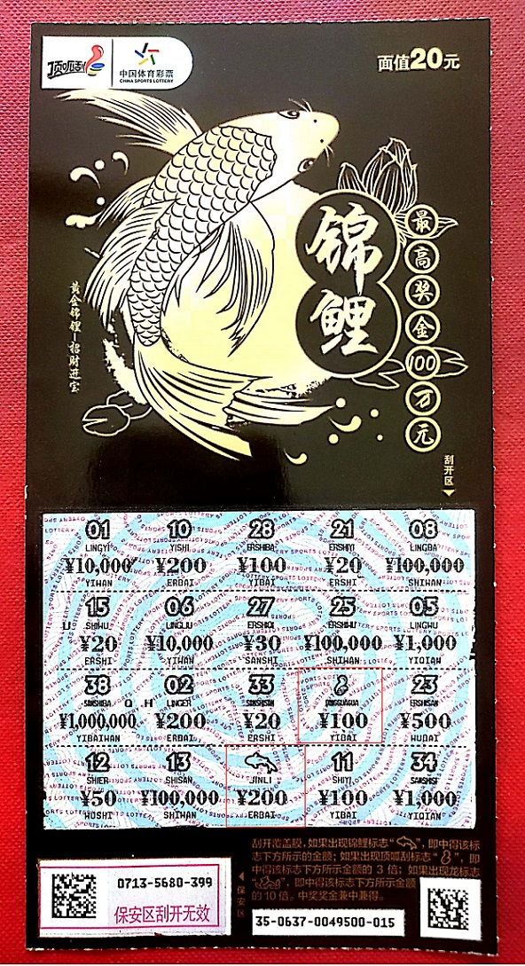 活动二是2020年5月15日9时至6月21日23时59分,购买任意面值的“锦鲤”系列即开型体育彩票,刮开覆盖膜如果出现“鸿运”字样,即可获赠价值1000元的苏宁卡一张,奖品全国共计8000张,派完即止。
