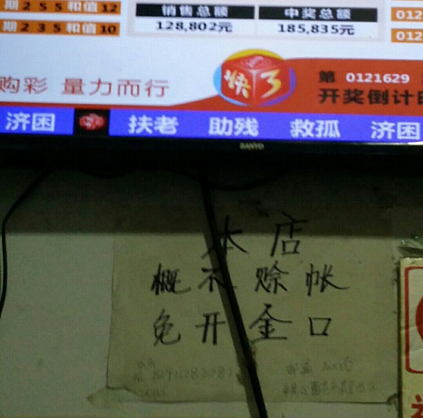在全国各地的彩票店,开奖电子显示屏成了吸引购彩者眼球的一景。在第33004体彩店内,电子显示屏上的开奖号码、销售信息和中奖信息不断滚动播出着,而就在显示屏的下方,白纸黑字的一张告示牢牢实实地贴在了墙上,上写十个字:“本店概不赊账,免开金口!”