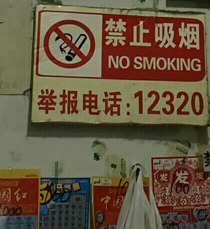 第33004体彩店,在电子开奖显示屏与体彩即开中奖展示票之间,有一个红色警示牌,上面写着“禁止吸烟”以及“举报电话:12320”的红字大字。