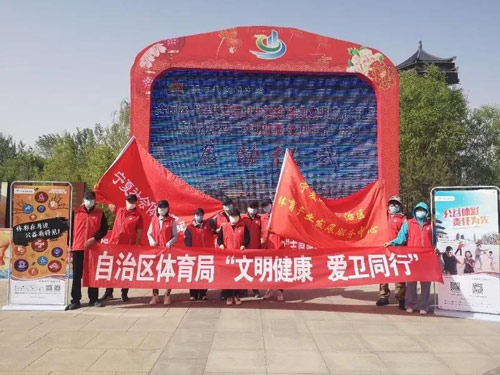 5月17日,自治区体育局志愿服务队协同宁夏体育彩票管理中心、社会体育服务中心、体育产业发展服务中心、宁夏亲水体育中心,参加银川市金凤区“深化爱国卫生运动 助力文明城市创建”志愿服务暨“文明健康 爱卫同行”活动。志愿者们严格按照要求,积极开展爱国卫生运动,清扫落叶,擦拭护栏,用实际行动迎接创城工作。