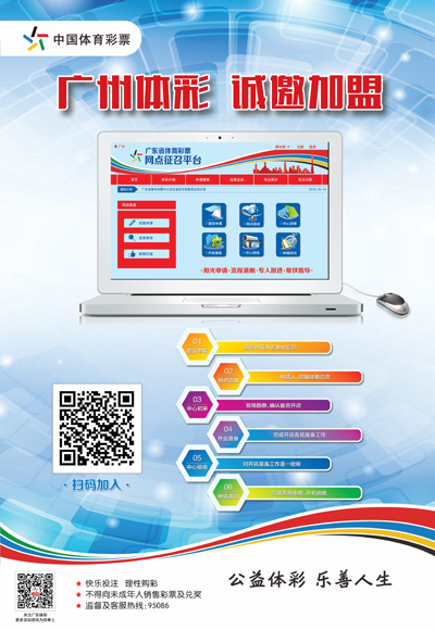 公益体彩,乐善人生!广州体彩邀您加盟中国体育彩票行业,投身社会公益事业,共同建设公益彩票、责任彩票。即日起,广州体彩面向全市公开征召体育彩票代销实体店,邀您创业当体彩实体店老板!