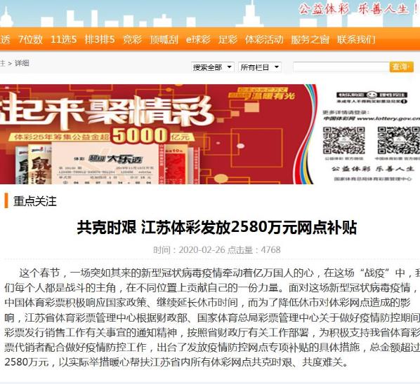 江苏体彩向每个体彩实体店发放2000元疫情防控专项补贴,总金额超过2580万元;广东体彩为全省1.3万多个符合条件的体彩实体店发放补贴,共计发放补贴2300多万元;陕西体彩拿出1000万元资金,帮助全省体彩实体店一起抗击疫情、恢复销售……据不完全统计,目前已有27个省(区、市)对体彩实体店进行专项补贴,总金额超过2亿元;有18个省(区、市)提高了代销费比例;还有很多省市通过为实体店配发防疫用品、为确诊代销者申请救助基金等方式,帮助扶持实体店。