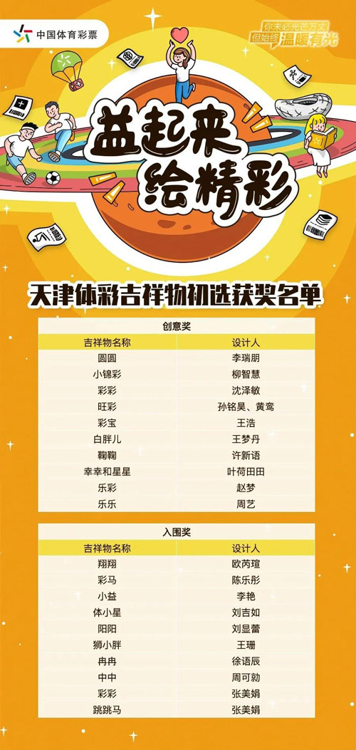 经过天津美院专家评委们对参赛的体彩吉祥物设计作品进行层层筛选、严格考核,最终10个创意奖作品和10个入围奖作品产生,快来看看都有哪些小伙伴们获奖了呢?