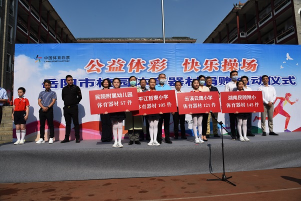 5月11日,湖南省岳阳市体彩分中心在湖南民院附小开展“公益体彩快乐操场”校园体育器材捐赠活动。岳阳市副市长李为,岳阳市教育体育局局长王德华、副局长李永波,湖南省体彩中心主任助理唐宇飚,岳阳市体彩分中心主任余金汉等参加了捐赠仪式。
