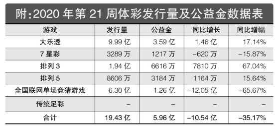 5月18日至24日,体彩全国联销游戏(大乐透、7星彩、排列3、排列5、全国联网单场竞猜游戏)通过19.43亿元的发行量,筹集了5.96亿元公益金。当周发行量比去年同期减少10.54亿元,同比降低35.17%。当周共开出6注1000万元及以上大奖,全部出自体彩大乐透。