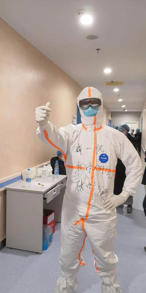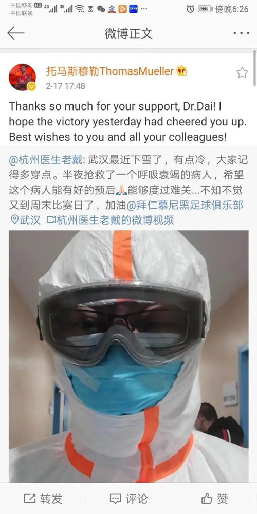 戴一帆收获的第一份惊喜,是在驰援武汉一周后的2月16日。在进隔离病区前,戴一帆穿着防护服自拍了一段“希望一切平安,武汉早日恢复正常,大家加油!”的视频,并以自己主队拜仁慕尼黑的信条“Mia San Mia”结尾。随后,他将视频上传到了自己的微博上。没想到,在当晚比赛结束后,拜仁俱乐部和偶像托马斯·穆勒都在微博上回应了戴一帆,并为他以及所有抗疫一线的勇士们送上了祝福。