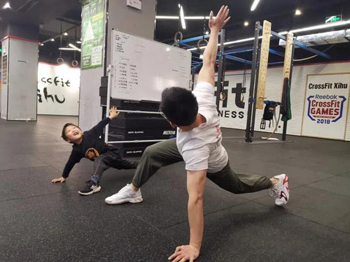 这场“私人订制”训练地点就在黄龙饭店负一层的CrossFit Xihu店,当朱迪夫妻俩带着大儿子如约出现在健身房时,映入眼帘的体能训练综合架、吊环杆、哑铃等各式运动器械让父子俩激动不已,迫不及待上手操练。
