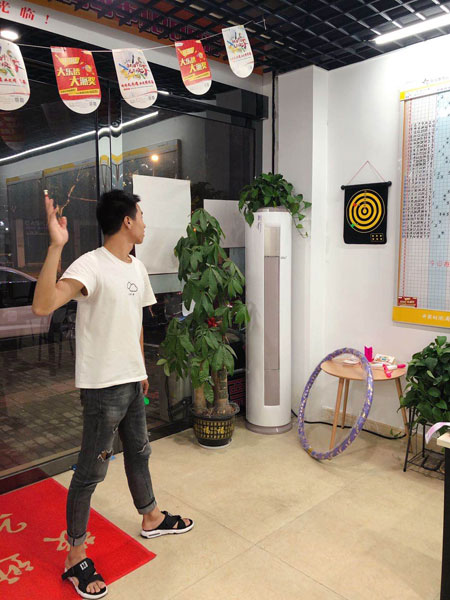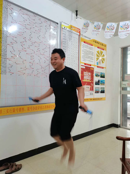 活动开展以来,江西体彩在实体店配备了飞镖、跳绳、呼啦圈、毽子等健身器材,购彩者们进店看到这些健身器材,都会忍不住要想试试。在鹰潭市3617030001体彩实体店,这几天来健身的购彩者络绎不绝,小张和小何都是80后,说起跳绳都说这是自己的强项,以前在学校跳绳比赛都是拿过冠军的,这回谁也不服谁,玩起了PK比赛,并约定谁输了就请客喝饮料。围观的购彩者也纷纷为他俩助威呐喊。