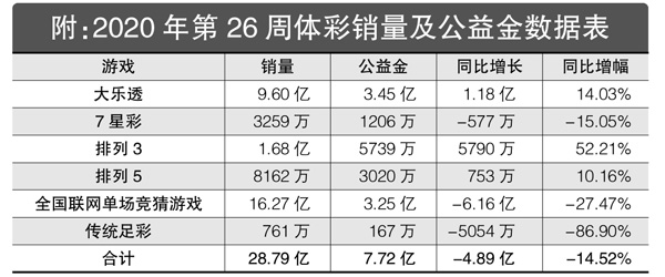 6月22日至28日,体彩全国联销游戏(大乐透、7星彩、排列3、排列5、传统足彩、全国联网单场竞猜游戏)通过28.79亿元的销量,筹集了7.72亿元公益金。当周销量比去年同期减少4.89亿元,同比降低14.52%。当周共开出10注500万元以上大奖,全部出自体彩大乐透。传统足彩在时隔142天后,于当周迎来第20008期开奖。