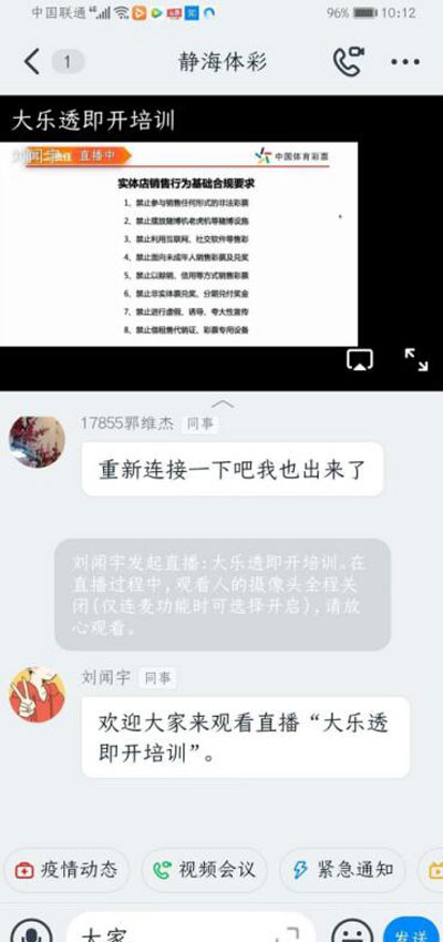 天津体彩一贯非常重视自身能力的提升,通过组织培训会议、完善实体店业务工作流程,在各类培训中不断强调“责任意识”、“理性投注”、“健康销量”的重要性,同时通过网络培训平台落实责任彩票相关培训,促进天津体彩从业人员责任彩票工作意识的进一步提升,为依法合规开展日常工作奠定了坚实的基础。自2020年初起,组织各种培训或线上会议开展的涉及责任彩票内容的培训20多场,涉及机构工作人员80余人,其中专管员30余人,实体店2000多家,销售员3000余人,做到了红线、基线、实体店销售行为基础合规要求人人知晓、落实到位。