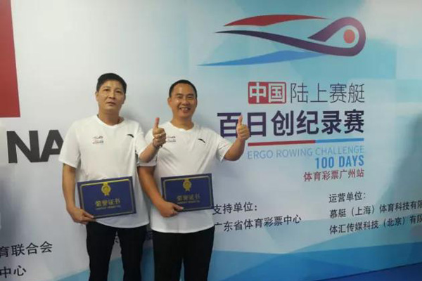 7月11日,2020中国陆上赛艇“百日创纪录赛”体育彩票·广州站第6个比赛日,广东体彩代销者杜炳钊和专管员薛佛宝有幸参加“半程马拉松”接力PK赛,两位加盟15人的广东力量队pk粤划粤年轻队,最终广东力量队创造了1小时20分57秒3的混合大团体全国纪录。