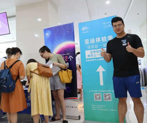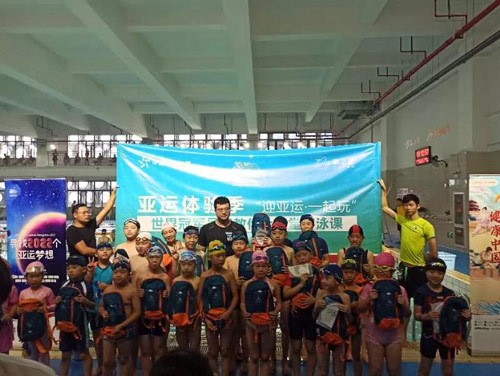 在现场,吴鹏还为学员们送上了由杭州体彩和鹏之星共同提供的运动礼包,包含一个迪卡侬运动背包、一顶泳帽以及五张面值10元的亚运主题即开型体育彩票。