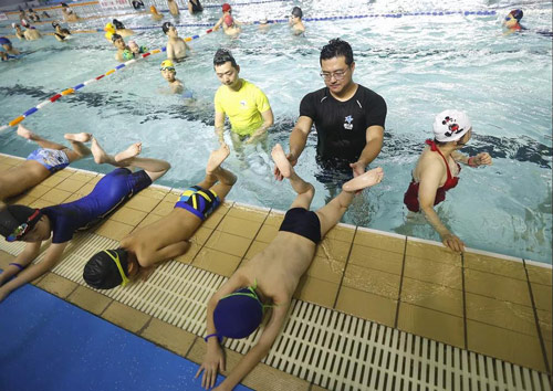 点名工作完成后,学员们人手一只更衣室手环,大家都迫不及待准备下水了。这次的游泳课,除了吴鹏,还有鹏之星的五位高颜值又专业的教练员一同参与指导,所有学员按水平分为初级班、中级班和高级班,陆上热身后入水开始上课。吴鹏给学员们手把手纠正,蛙泳腿、换气动作、手臂动作都教了一遍,整个游泳馆都洋溢着快乐的氛围。