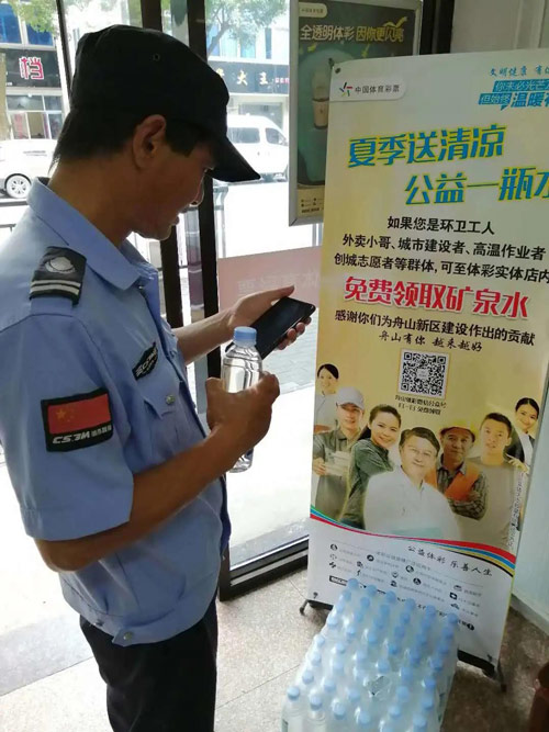 7月10日起舟山体彩在线下182家实体店,共投放30000瓶定制矿泉水。免费分享给环卫工作者、创城志愿者、外卖小哥等高温作业者为他们送去清凉的同时给他们一处避雨的场所。看着领水的他们露出真心的笑容,我们也真诚地感谢他们为城市建设作出的所有贡献。
