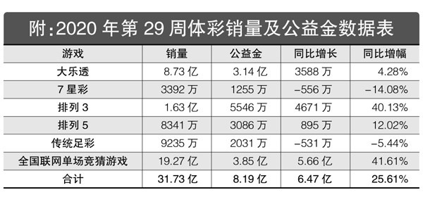 当周竞猜型游戏通过20.20亿元的销量,筹集了4.05亿元公益金。当周销量比去年同期增加5.61亿元,同比增长38.46%。
