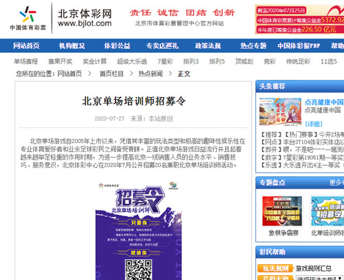 7月27日,北京市体彩中心在其官网发布“北京单场培训师招募令”,面向社会公开招募20名兼职兼职北京单场培训师。