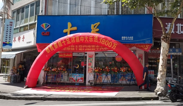 近日,位于泰顺县罗阳镇北大街160号的十足便利店喜气洋洋,一眼就能看见店门前搭建的红色充气拱门,上面写着“恭喜泰顺十足店喜中大乐透1800万”,地面上则铺着大篇幅的中奖宣传图。