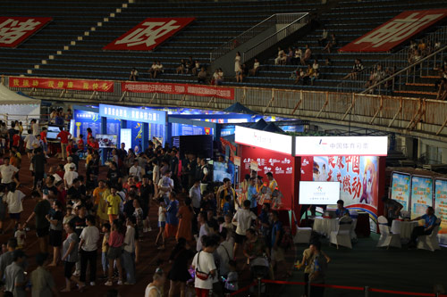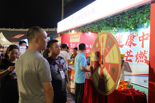 “随风奔跑自由是方向……”中心舞台上,动感的音乐带领人们开启这场属于体育的狂欢夜。体育主题歌曲配上校园乐队,让大家燃起了运动的激情。中心舞台对面的中国体育彩票展位,“健康中国 光芒燃动”活动如火如荼的开展中,只要参与运动打卡,即可参与幸运大转盘抽奖。