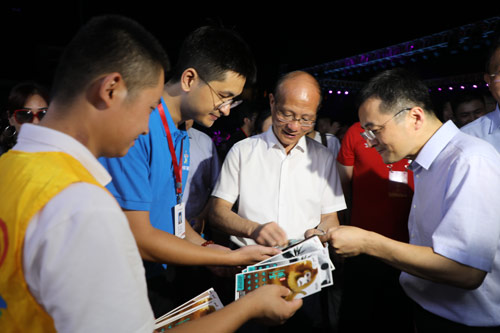 在热闹的鸣锣声中,南昌首届体育夜市开市,省委常委、南昌市委书记吴晓军一行参加全民健身日活动,并关心体育彩票事业发展。