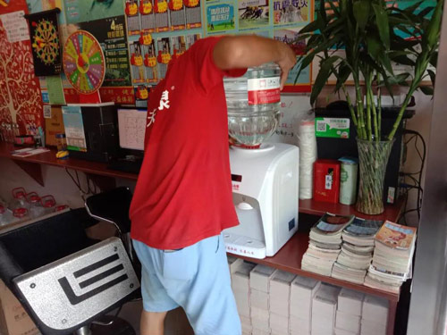 分中心工作人员顶着高温烈日,把饮水机和每家10桶纯净水送到实体店,“公益体彩、乐善人生”的标签格外醒目,让每一个实体店俨然成为一个清凉驿站,不仅给销售员和购彩者带来清洁饮水,也为过路的环卫工人、快递小哥等户外工作者提供了清凉便利。