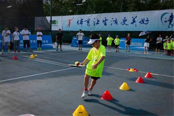 活动中,孩子们身手敏捷,步履轻盈,专注地“过关斩将”,他们通过参与“持拍绕障碍”“投球进桶”“持拍夹球”“打目标”四个小游戏,接触网球运动,进一步了解网球运动。在“持拍绕障碍”游戏中,小朋友要手持球拍将球放到拍面上,绕着障碍移动,如中途球掉落则要重新回到起点;“打目标”游戏则需要小朋友通过正手击球至指定区域,每人最多有十次击球机会。现场传来孩子们阵阵欢声笑语和场边家长们的加油助威声。