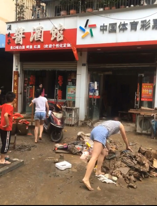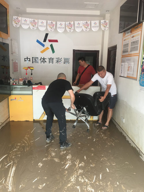 在走访受灾体彩实体店的过程中,发现乐山市有70家实体店遭受不同程度灾情,最深进水达到1.6米。8月19日一早,洪水退去,乐山分中心工作人员兵分三路,立即到受灾实体店帮助清理淤泥,抢救设备。不过,由于电力部门当时尚未恢复供电,大部分实体店仍无法正常营业。