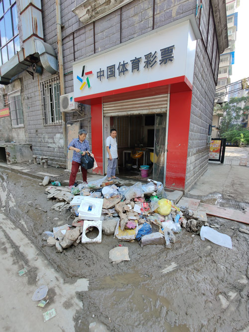 在40146体彩实体店外,堆放着被水浸泡和被淤泥覆盖无法使用的物资,店内的清理工作已基本完成。据该店销售员介绍,他们一家人是在凌晨3点,当洪水即将退去时开始店内的清理工作的,一直忙到上午9点清理工作才接近尾声。这位销售员还表示:“要不是乐山分中心的同志们帮忙,可能这会还在挖泥巴。虽然体彩中心的保障工作很及时,但实体店的自救也不能停顿,我们想尽快恢复营业,时间不等人啊!”