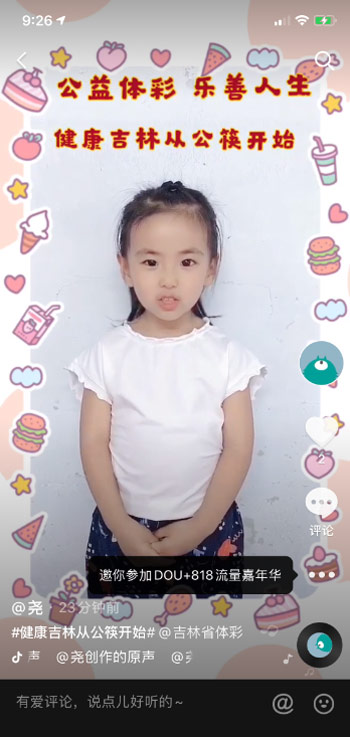 “多一双公筷,多一份健康。我承诺,我倡议,健康吉林从公筷开始,做文明公筷的践行者!”这段抖音短视频来自网友“尧”的女儿。“尧”介绍说,自己是体彩从业人员,当得知吉林省体彩中心推出#健康吉林从公筷开始#短视频征集活动后,就让女儿录制了这样一个作品。“我觉得这个活动非常好,使用公筷是一个很好的用餐习惯,可以有效地阻断病毒和病菌的传播,自从女儿录制这个视频后,每顿饭她都监督全家人使用公筷,督促我们养成良好的卫生习惯。”