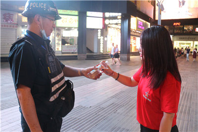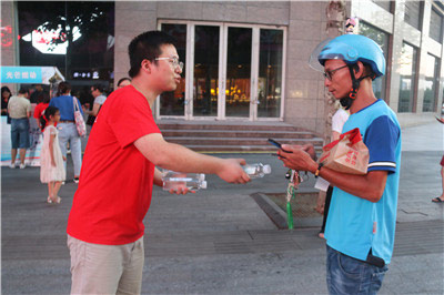 在金华西市街步行街上,金华体彩的工作人员为外卖小哥、行政执法工作人员、公安巡警等户外工作者送上一瓶瓶定制的矿泉水,在这个夏日,为他们送上一份关怀和清凉。