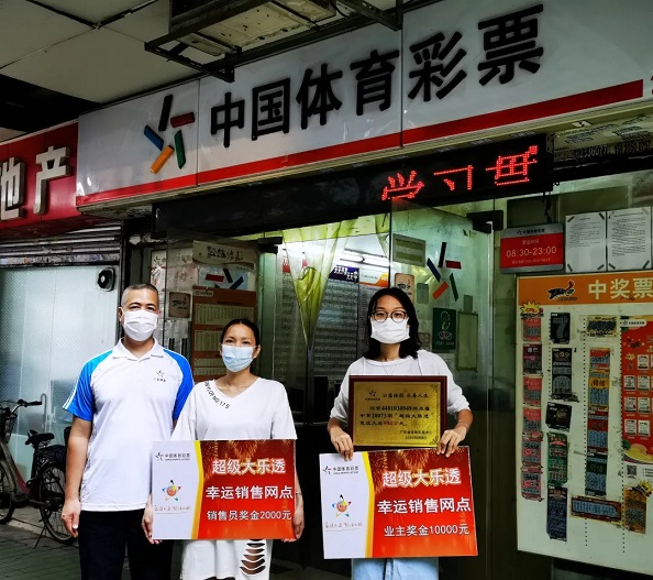 8月19日,广州市体彩中心为位于荔湾区环市西路72号的30949体彩实体店举行庆祝仪式,庆祝该店售出大乐透第20073期994万元中奖彩票。该店代销者获得奖励金1万元,销售员获得奖励金2000元。当期,该店一购彩者凭借一张6+3复式票,中得1注974万元一等奖,单票奖金达994万元。目前,该中奖者已经领奖。