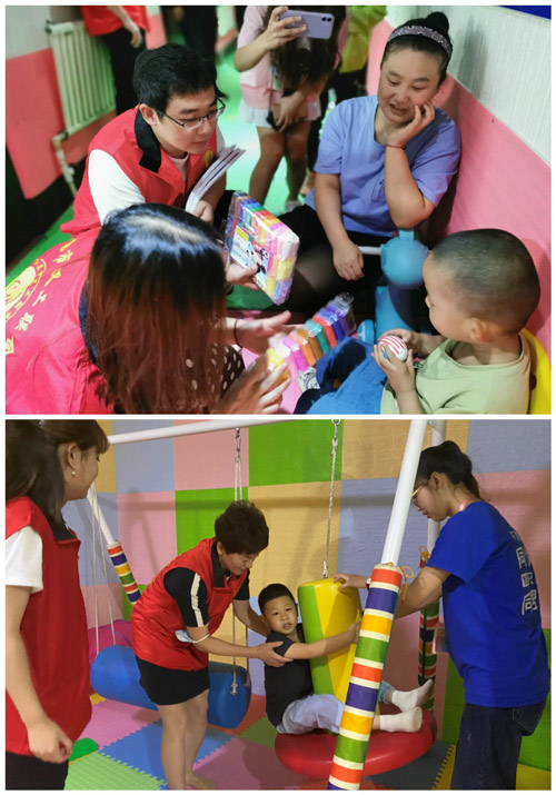 义工队员们在康复中心老师的带领下来到孩子们的活动室,在老师的指导下,他们有的与孩子们开始进行一对一、面对面的耐心交流、讲故事,有的和孩子们一起画画、搭积木、荡秋千,有的则协助老师制作教具、帮助孩子们专心上课和进行康复训练。义工队的志愿者们和孩子们热情互动,给孩子们带来鼓励和欢乐,帮助他们树立信心。他们用耐心、细心、真心搭起一座通往这群来自星星的孩子的心灵的桥梁,用爱点亮了孩子们孤独的心,陪伴他们度过一段难忘快乐的时光。