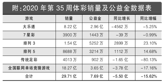 当周,大乐透通过8.22亿元的销量,筹集了2.96亿元公益金。当周销量比去年同期减少4562万元,同比降低5.25%。