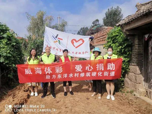 8月18日,威海体彩中心志愿者们一行到威海乳山南黄镇东洋水村,为该村送来5000元爱心款助力该村修筑硬化街道工程。
