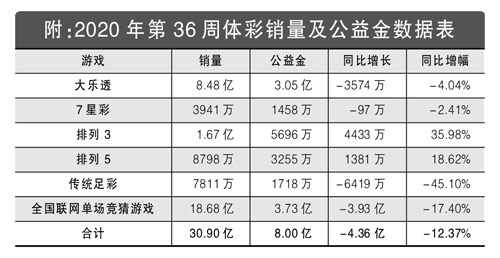 8月31日至9月6日,体彩全国联销游戏(大乐透、7星彩、排列3、排列5、传统足彩、全国联网单场竞猜游戏)通过30.90亿元的销量,筹集了8.00亿元公益金。当周销量比去年同期减少4.36亿元,同比下降12.37%。当周共开出30注500万元以上大奖,全部出自大乐透。