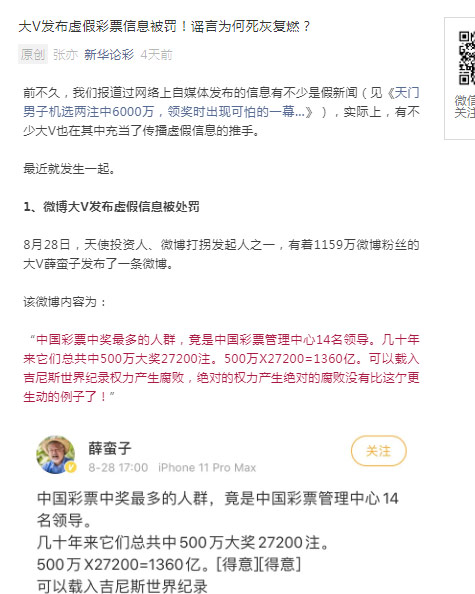 其实,除了薛蛮子,不少大V都质疑过彩票的真实性,如白岩松、老梁和马未都等。由于他们都是名人,言论传播甚广,在网络上一搜遍地都是;此外,他们的一些言论被不少自媒体加工改造,也已偏离了原意。