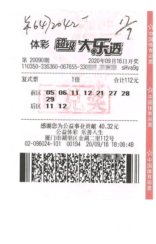 9月16日,体彩大乐透第20090期开奖,厦门市湖里区金湖二里112号96024实体店一购彩者凭借一张8+2复式票,中得一等奖1注、四等奖15注、六等奖30注、八等奖10注,奖金合计6472042元。