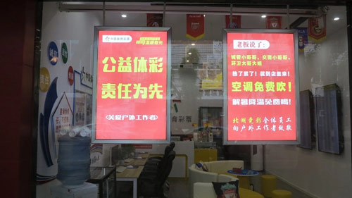 四川南充70777体彩实体店是今年6月开业的一家新店,玻璃上贴着“公益体彩 责任为先”的海报,欢迎户外工作者进店歇脚,还特意说明“空调免费吹”“解暑降温免费喝”。