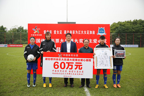 2019年2月23日,体彩大乐透第19020期开奖后,湖北鄂州一位购彩者命中300注追加二等奖,个人总揽奖金达3178万元。中奖者于当年4月1日现身领奖时,主动捐赠120万元支持公益事业和体育事业,其中60万元就是定向捐赠给武汉江大女足,另外60万元则用于定向资助鄂州市孤寡老人。2019年4月27日,在女足的足协杯赛事于武汉塔子湖体育中心足球场举行期间,武汉江大女足俱乐部携手湖北省体彩中心举行了相关爱心款捐赠仪式。可以说,从那个时候开始,武汉江大女足在征战绿茵赛场的同时,球队也承载着购彩者的爱心,她们的每一场比赛也都是载爱之旅。