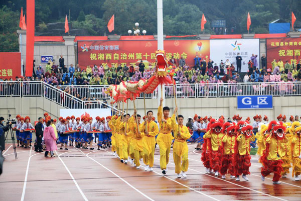 10月17日上午,湘西土家族苗族自治州第十四届运动会开幕式在花垣县全民健身中心运动场举行,湘西州8县市及湘西经济开发区共9个代表团参加本届运动会。本届运动会以“安全、节俭、和谐、圆满”为主题口号,设青少年组、成人组两个组别,设摔跤、乒乓球、体操等12个大项,共设金牌357枚,是湘西州举办的规模最大、参赛人数最多、项目最全的综合性体育赛事。