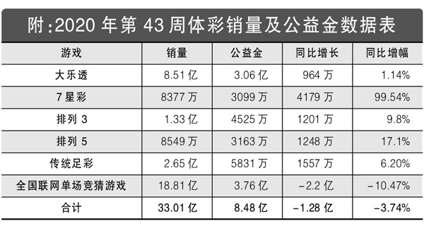 当周竞猜型游戏通过21.47亿元的销量,筹集了4.34亿元公益金。当周销量比去年同期减少2.03亿元,同比降8.63%。
