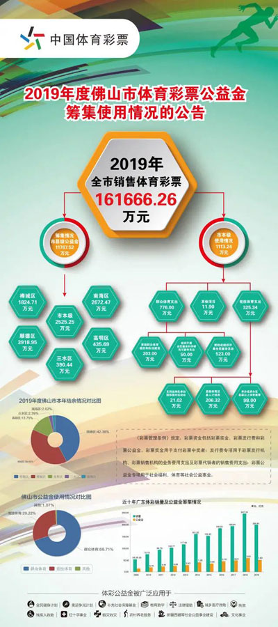 此前,佛山市文广旅体局公布的《关于2019年度佛山市体育彩票公益金筹集使用情况的公告》显示,在2019年的体彩销售中,传统型彩票51626.53万元、即开型彩票11253.47万元、足球彩票98786.25万元。