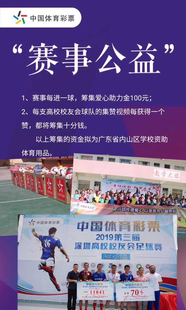 广大球迷和高校校友们可关注深圳体彩微信公众号,进入“校友足球”,为心仪的高校球队打Call,欣赏赛事集锦,尽览高校足球魅力,并可参与赛事公益,为改善山区学子体育教学条件助力。
