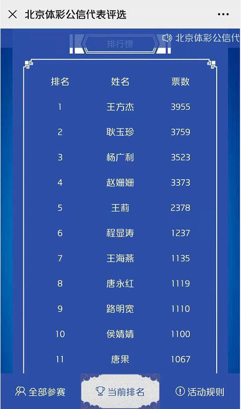 北京体彩这一年度评选盛事吸引目光无数,在为期7天的投票时间里,超过30万人到访投票页面,投票总数累计超过3万张。11月24日19时,活动投票时间截止,根据公众的投票,最终10名“体彩公信代表”名单新鲜出炉。名单中,有体彩专管员,有体彩业主,也有体彩销售员。